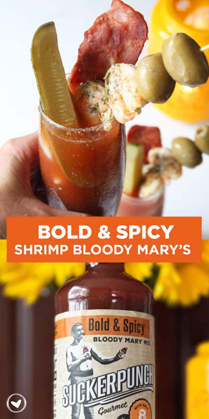 OMG! These are my absolute favorite Bold And Spicy Shrimp Bloody Mary's! They are really easy to make and have so much flavor! I've been working with Suckerpunch to bring you delicious pickle recipes and I have to tell you, their Bloody Mary mix is my new favorite! It is so flavorful all on it's own. I love a good Bloody Mary that's not too spicy but packs a lot of flavor and this one does just that. Add in some grilled shrimp, bacon, olives and a pickle for the best Bold and Spicy Shrimp Bloody Mary!