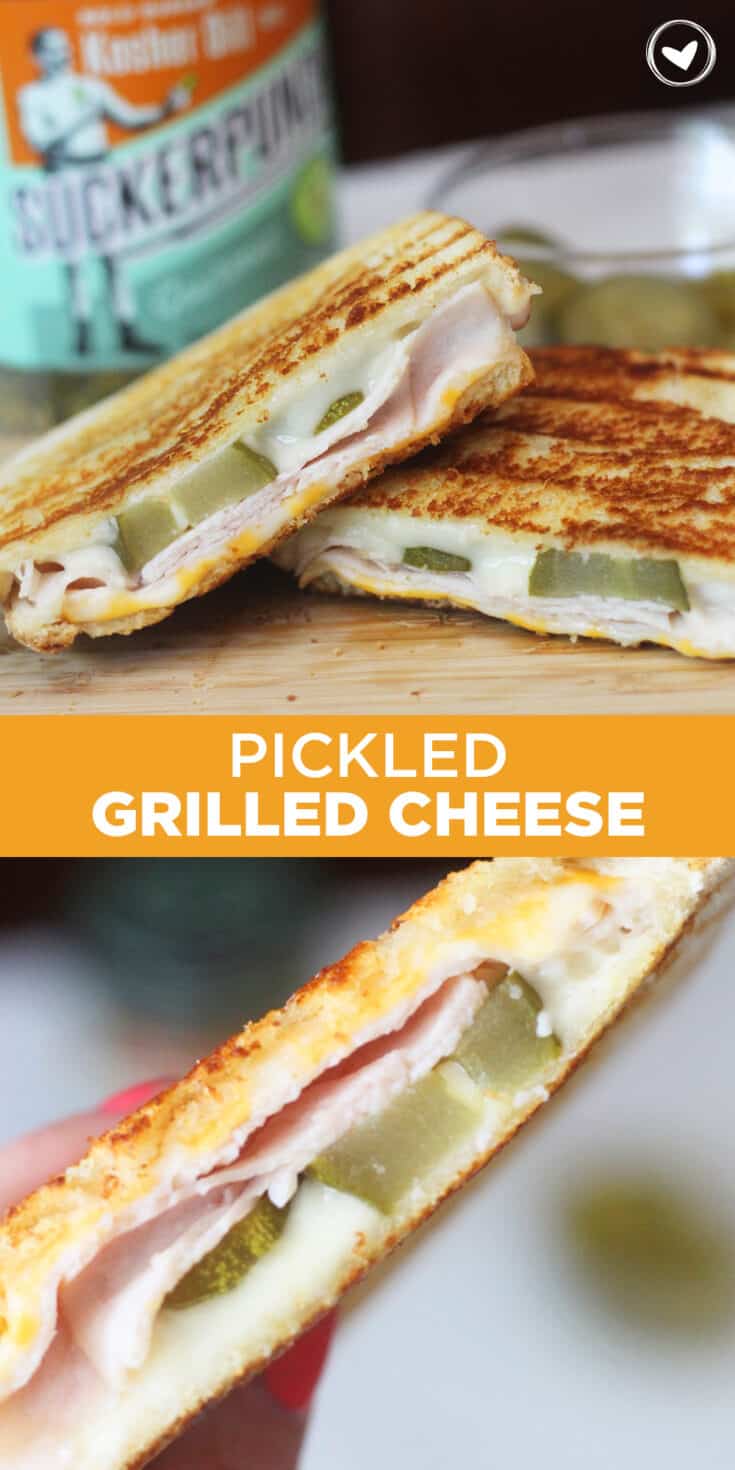 If you're a fan of pickles, you're going to love this Pickled Grilled Cheese With Turkey! The kiddos have always loved grilled cheese with a side of pickles so I decided to give it a try as a sandwich and let me tell you, it's fantastic. As a bonus, I added in a few slices of turkey lunch meat and this sandwich will give you 28 grams of protein! Win, win! I'm also excited to bring you this tasty recipe in partnership with our friends at SuckerPunch, the tasty pickles that pack a punch! Grab the full recipe for this pickled grilled cheese with turkey below!